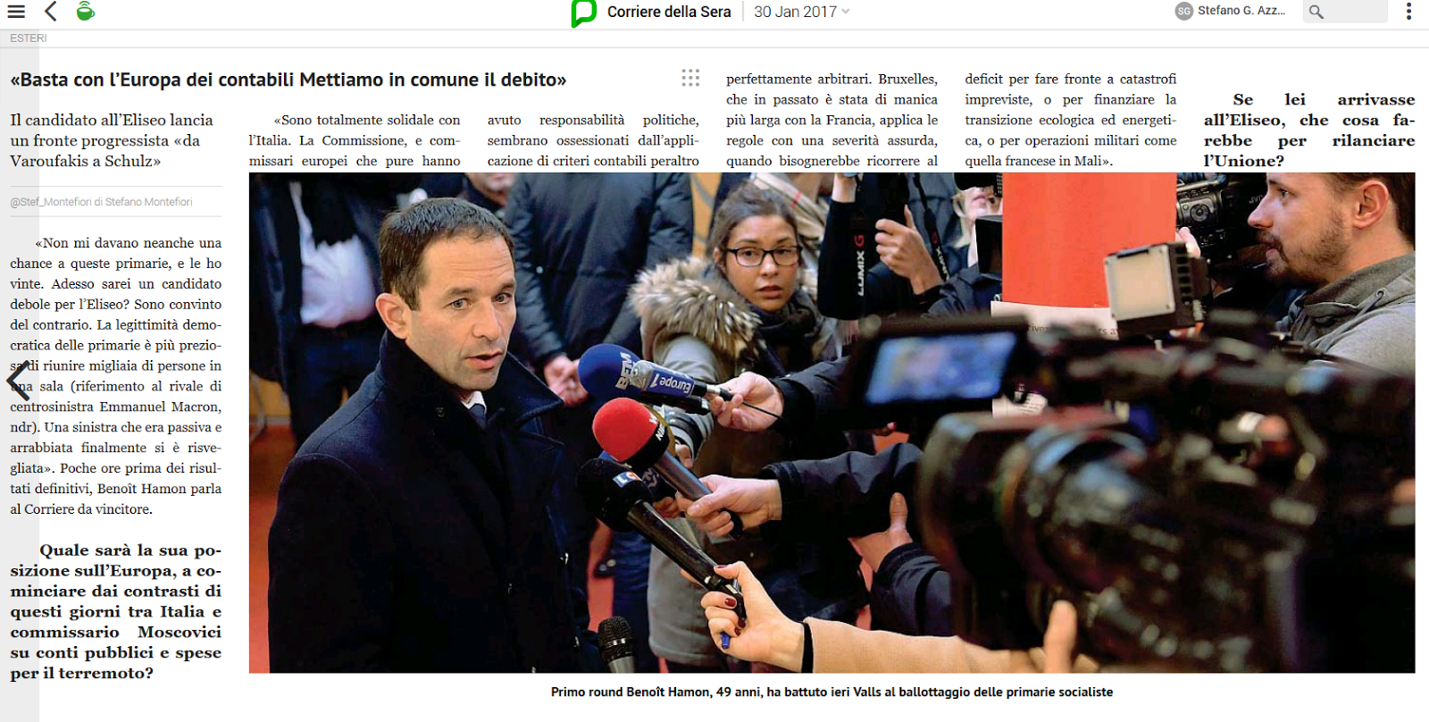 «Hamon non rappresenta una sinistra movimentista, solo di protesta e di opposizione. Lui vuole il potere. Le sue proposte sono discutibili, si può essere perplessi sulla fattibilità di alcune misure, ma sono lo specchio di una nuova visione del mondo, del lavoro, dell’ecologia».